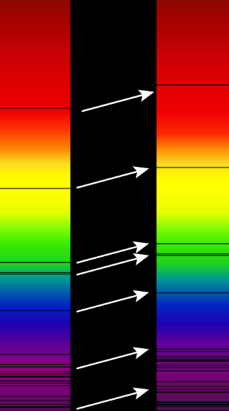 Grâce à des observations spectroscopiques, il est possible de comparer les longueurs d’onde de raies d’émission ou d’absorption présentes dans le spectre d’une galaxie avec celles que l’on observe en laboratoire pour les mêmes éléments physico-